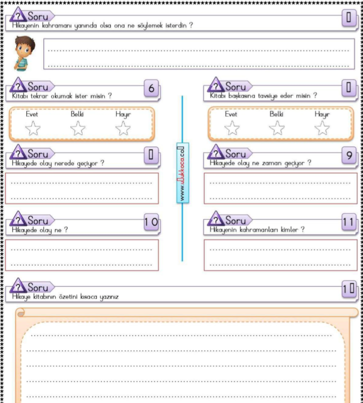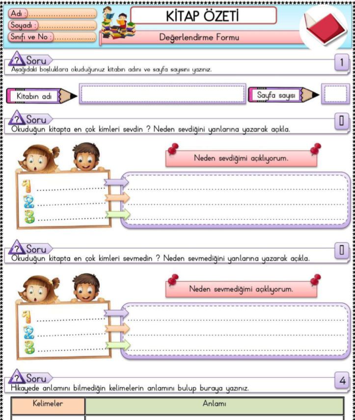 Bu kitaplar öyle “okudum öğretmenim, sorulara eften püften cevaplar verir geçerim” şeklinde değil. Kitaplar için bir form hazırladım önlü arkalı, kitabın adı ne, sayfası kaç, neyi beğendin neyi beğenmedin, nerede geçiyor gibi bir sürü sorusu var ve bu formu şart koştum.